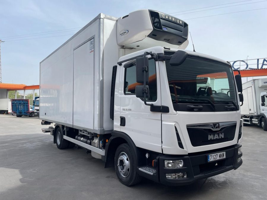 CAMION FRIGORIFICO CON EQUIPO DE FRIO CARRIER SUPRA 850, MMA 11.990 KG, CARGA UTIL 4.495 KG, CARROCERIA CON PUERTA LATERAL, MEDIDAS INTERIORES: 5.85 X 2.46 X 2.30, VOLUMEN 33 M/3, CABINA CORTA CON 2 PLAZAS, CAJA DE CAMBIO ROBOTIZADA, 6 VELOCIDADES, 190 CV, A/C, DEPOSITO ADBLUE, SUSPENSION NEUMATICA, PLATAFORMA ELEVADORA DE 1500 KG.